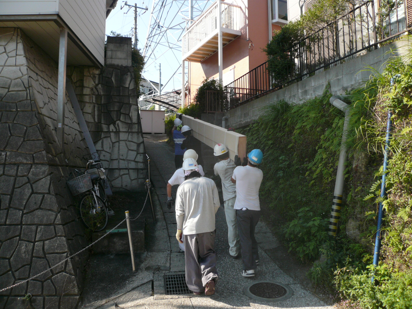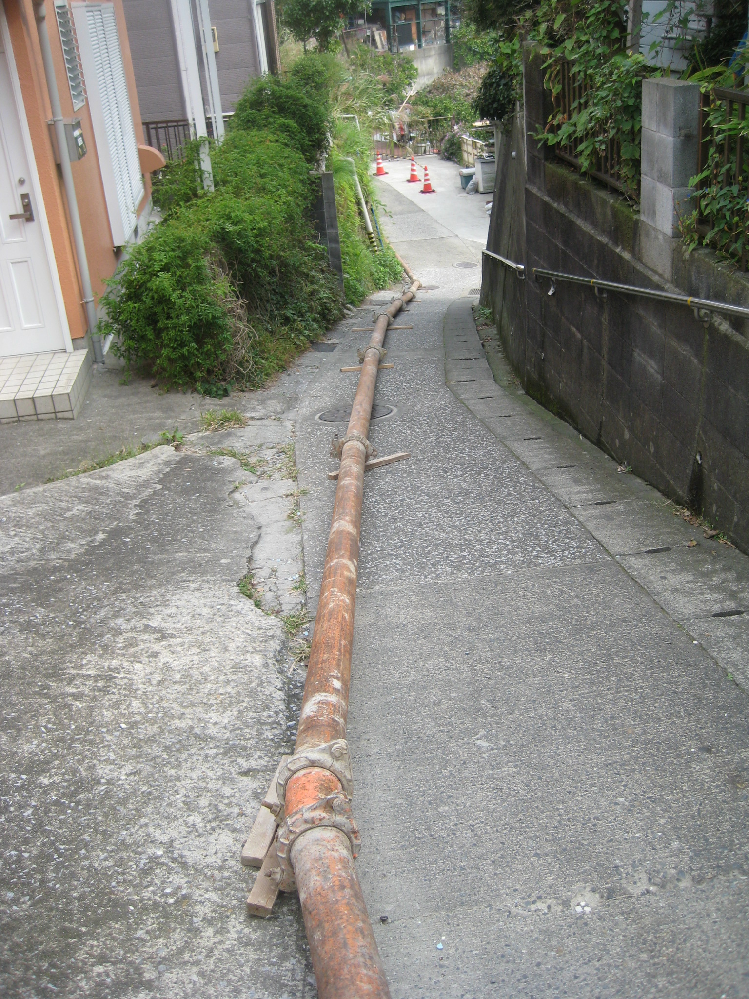 これらは全て資材の搬入は担ぎ上げだったりしますし、コンクリートの圧送も配管を繋いで行う必要があります。